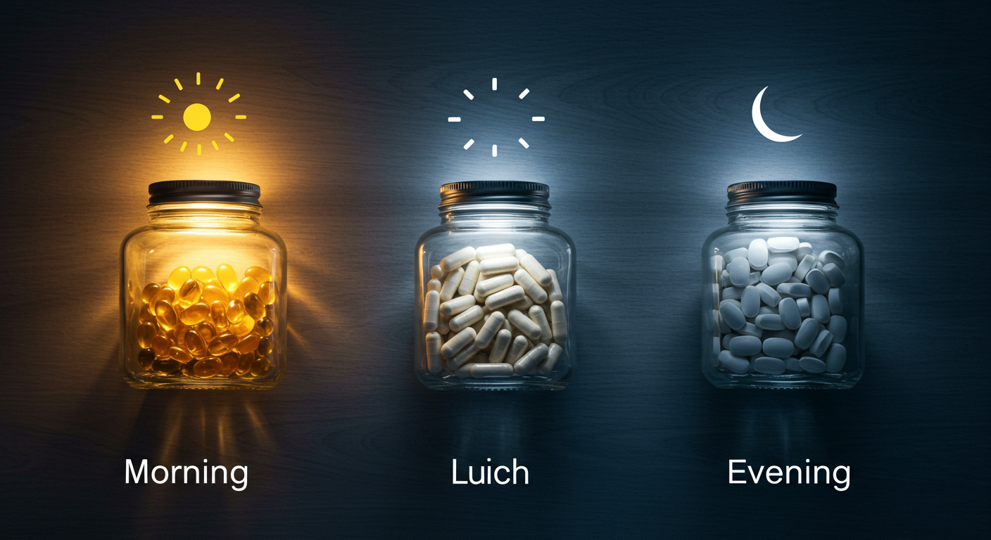 | 아침 식후 | 비타민 B군, 비타민 C, 철분, 코엔자임 Q10 | 에너지 생성, 피로 해소, 흡수율 극대화 |