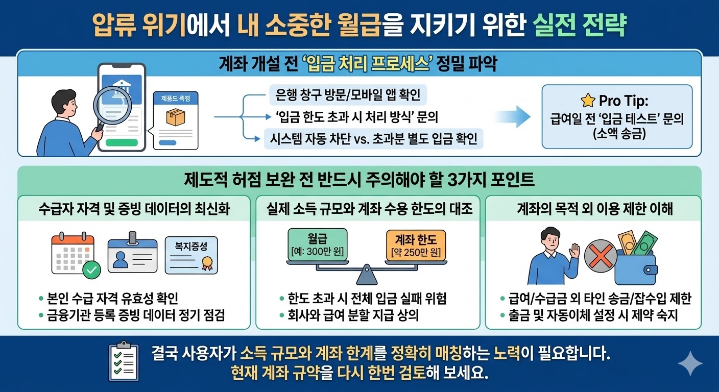 가장 권장되는 방법은 고용주와 협의하여 급여를 분할 입금받는 것입니다. 법적 보호가 필요한 250만 원은 생계비 계좌로 받고, 나머지 차액은 일반 계좌로 나누어 수령함으로써 소득의 반환이나 입금 거절 사고를 미연에 방지할 수 있습니다.