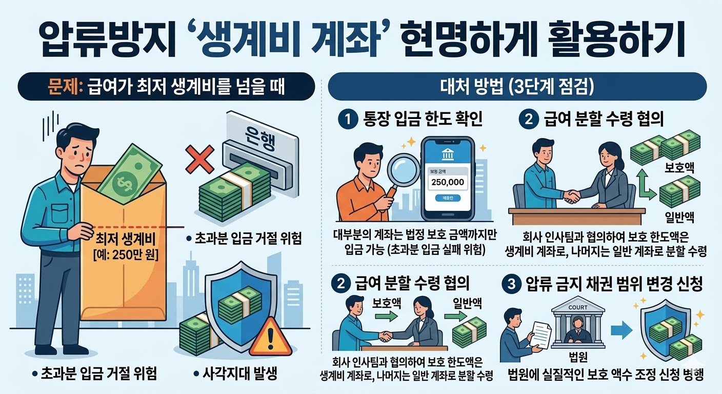- 급여 분할 수령 협의: 회사 인사팀과 협의하여 보호 한도 금액은 생계비 통장으로, 나머지는 일반 계좌로 나누어 수령할 수 있는지 확인하십시오.