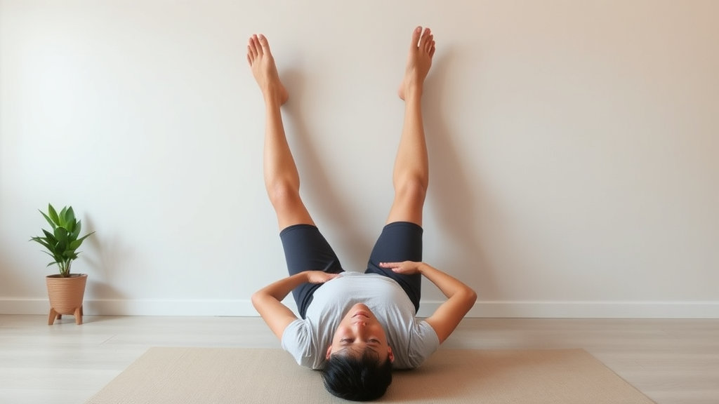 벽 앞에 누워 다리를 벽에 수직으로 올립니다. 엉덩이는 벽에 최대한 가깝게 두고, 팔은 몸 옆에 편안하게 둡니다. 허리 아래 볼스터나 담요를 접어 받치면 더욱 좋습니다.